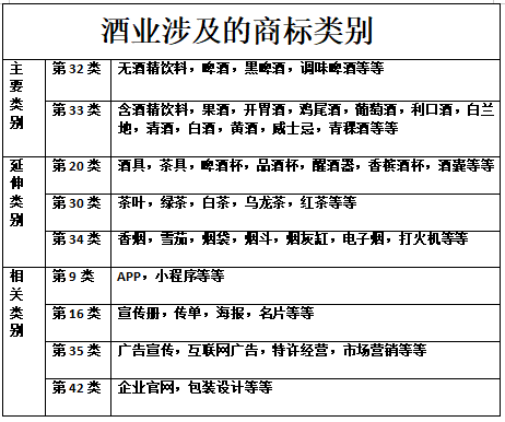 白酒行業(yè)的核心商標(biāo)是第33類,其主要涉及含酒精的飲料(啤酒除外)。我們都知道白酒啤酒不分家,所以第32類也必須納入到核心相關(guān)類別;當(dāng)然更少不了第40類的釀酒服務(wù)類別和第05類的藥酒類別;但是第01類的工業(yè)用酒精相關(guān)產(chǎn)品并不在此列,因?yàn)榻裉煳覀冎饕v的是可食用的酒而非工業(yè)用的酒精,但做為防御性商標(biāo)也是必申請之列;